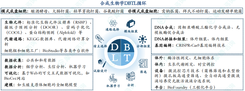 底盘细胞构建是合成生物学的“硬件”基础,包括底盘细胞的选择、DBTL循环、目标细胞的设计与改造等,涉及基因测序、基因编辑、基因合成等使能技术。