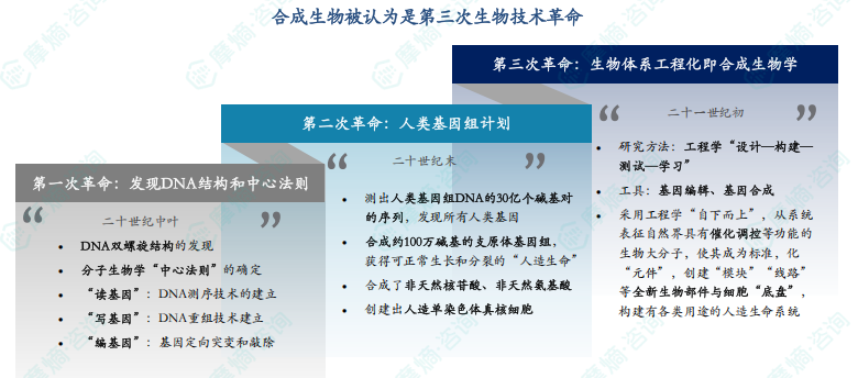 合成生物学被认为是“第三次生物技术革命”,市场前景广阔,在中国展现出强劲的发展势头和商业价值。本文基于摩熵咨询最新发布的《合成生物产业发展前景及中国产业链上中下游企业分析》研究报告部分内容,旨在探讨合成生物行业的定义、基本原理、制造工艺流程以及行业发展趋势。