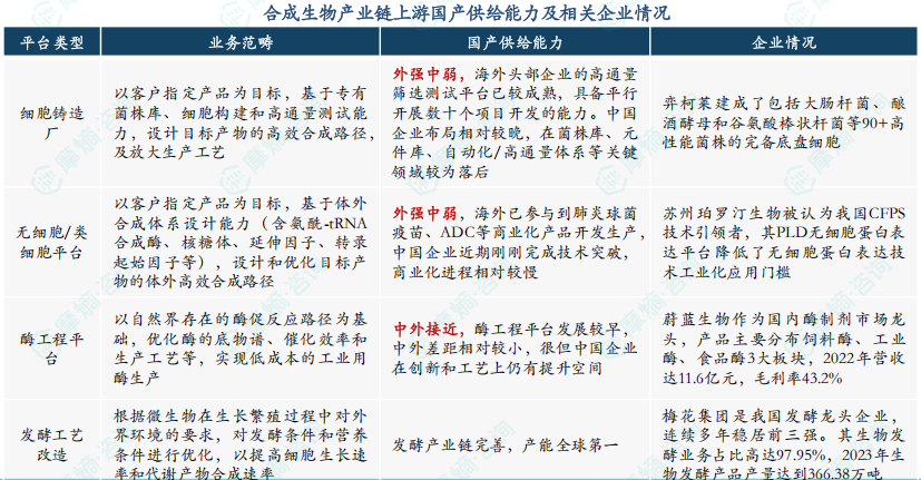 合成生物产业链上游国产供给能力及相关企业情况