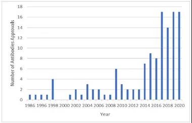 图2.1986年-2020年间获批抗体药物统计图(n=125)