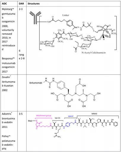 2000年,第一列ADC药物Pfizer'sMylotarg™上市。在此之后,ADCs陆续不断接连面市,并逐渐成为癌症治疗的最显著疗法之一。Mylotarg™平均药物抗体比(Drugto Antibody Ratio,DAR)可实现每分子量抗体承载2-3个分子量的卡奇霉素。虽然MylotargTM已被撤回,但在2017年又被重新引入市场。至今为止,已有10种ADCs在售。