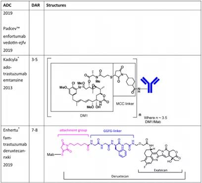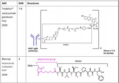 2019年,三种ADCs获批上市,分别是Enhertu®、Polivy™及Padceu™。它们都含有肽连接子和一个共同的间隔连接基团。间隔连接基团由药物上的己酸和抗体上附着的马来酰亚胺组成。2020年获批的Trodelvy™有着和Enhertu®类似的药物结构。Trodelvy™是靶向Trop-2的新型首创ADC药物,其活性成分为戈沙妥组单抗(Sacituzumab Govitecan-hziy),由靶向TROP-2抗原的人源化IgG1抗体与化疗药物伊立替康(一种拓扑异构酶I抑制剂)的代谢活性产物SN-38偶联而成,