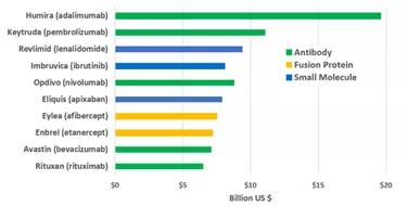 图1. 2019年全球最畅销药物排行前十名(净销售额计)