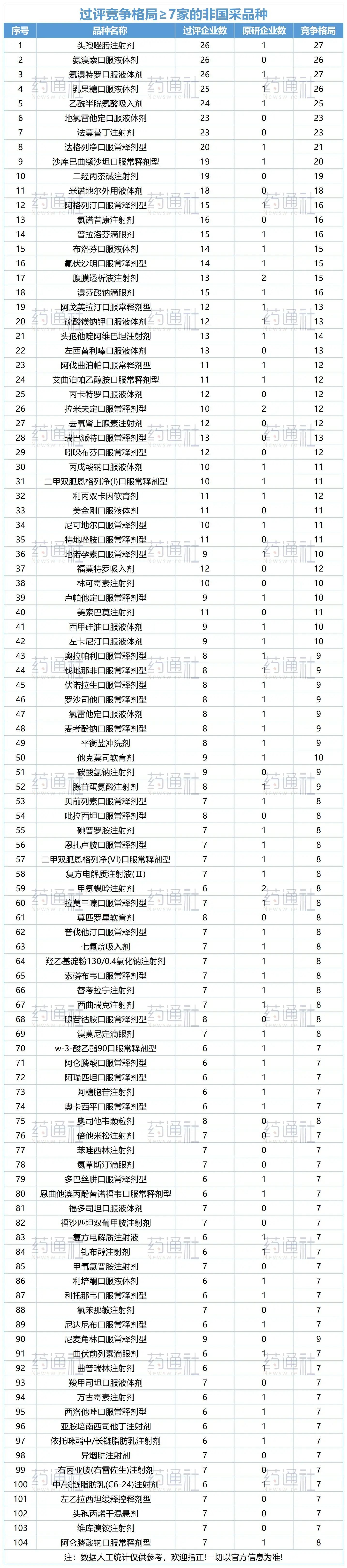 附件:过评竞争格局≥7家的非国产品种,数据更新至1月20日,竞争格局符合条件不一定会纳入国家集采,一切信息以官网为准!
