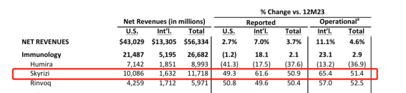 艾伯维的Skyrizi(利生奇珠单抗)在2024年销售额达到了117.18亿美元,同比增长50.9%。这一成绩标志着Skyrizi成为艾伯维继Humira之后的下一个百亿美元大单品。Skyrizi的成功得益于其在炎症性肠病和皮肤病治疗等领域广泛的应用前景,该产品被《Nature》预测将进入2025年全球畅销榜前五名。此外,2024年6月,Skyrizi获得FDA批准用于治疗中度至重度活动性溃疡性结肠炎成人患者,至此该产品已斩获包括斑块状银屑病、银屑病关节炎、克罗恩病等在内的7项适应症。