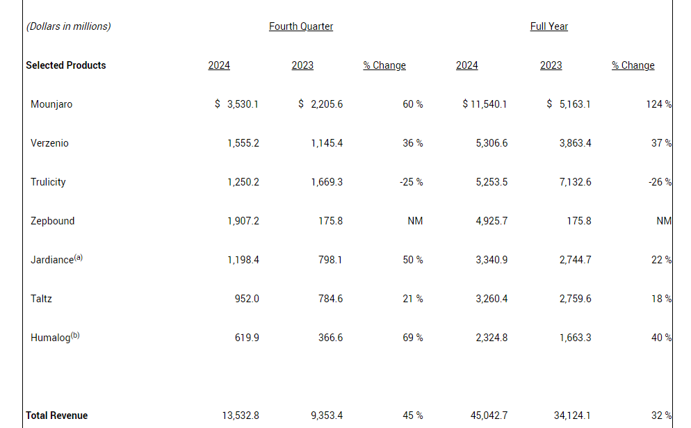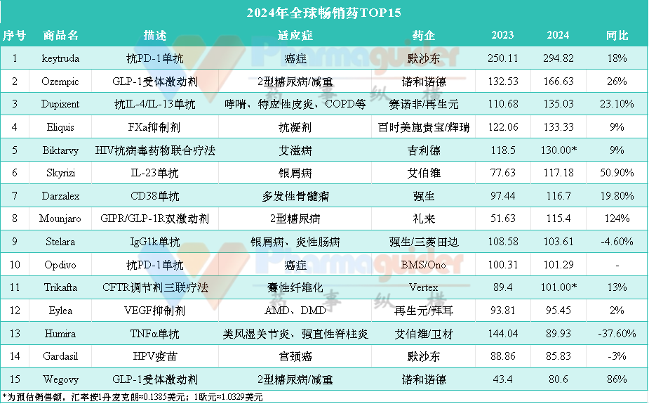 礼来的Mounjaro(替尔泊肽)在2024年的销售额首次突破百亿美元,达到115.4亿美元,同比增长124%。Zepbound替尔泊肽减肥版全年销售额49.26亿美元同样表现非凡,有望在2025畅销榜单中一飞冲天。