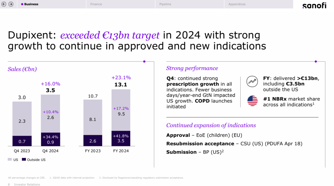 2024年,Dupixent(度普利尤单抗)作为赛诺菲的王牌产品,其全球销售额达到了135.03亿美元,同比增长23.1%,成为全球自身免疫药物市场的领头羊,这一成绩反映了Dupixent在自身免疫疾病治疗领域的强劲需求和市场潜力。