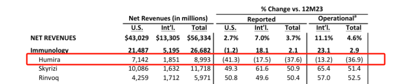 艾伯维的Humira(阿达木单抗)曾是全球最畅销的药物,但由于专利到期和生物类似药的竞争,其销售额开始逐年下滑。2024年,Humira的销售额以37.6%的下滑速度降至89.93亿美元。这一变化标志着Humira不再占据“药王”的位置。