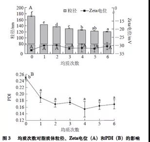 结果显示:增加均质压力和均质次数可显著降低脂质体囊泡的粒径,但均质压力和均质次数分别高于50 MPa和3 次后,脂质体囊泡粒度的降低以及其物理稳定性的提高效果不再显著,甚至当均质压力大于50 MPa时,PDI有所增大[2]。