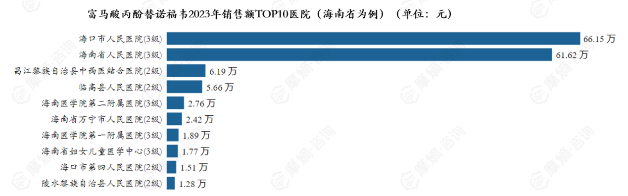 下图展示了富马酸丙酚替诺福韦2023年销售额TOP10的医院,可以看出销售额排名前三的医院(海南省为例)分别为海口市人民医院、海南省人民医院、昌江黎族自治县中西医结合医院。