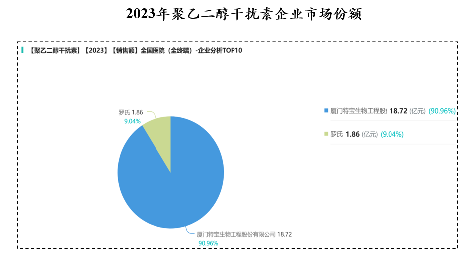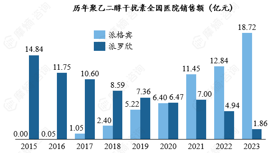 截至2024年10月,我国获批用于慢性乙肝治疗的长效干扰素只有三款产品,分别为罗氏派罗欣、默沙东佩乐能以及特宝生物派格宾。默沙东的佩乐能已经停产,特宝生物派格宾于2016年获批上市,为首款国产长效干扰素。据摩熵医药销售数据库显示,派罗欣近年来销售额逐步下滑,主要原因为受派格宾竞争,罗氏调整了其在中国大陆地区地市场策略,派罗欣已于2022年末退出中国市场。而派格宾由于具备本土优势,获批上市后销售额实现快速增长,于2021年首次突破10亿,2023年派格宾全国医院销售额为18.72亿元,市场份额达90.96%。