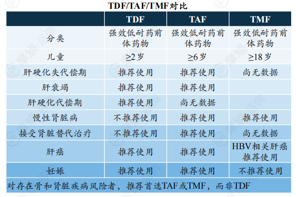 艾米替诺福韦(TMF)是江苏豪森药业自主研发的1类新药,于2021年获批上市,是一种新型核苷酸类逆转录酶抑制剂。与TDF、TAF相比,TMF靶向效果非常突出,对机体的骨密度和肾脏的影响也明显少于前两者,具有更高的安全性。