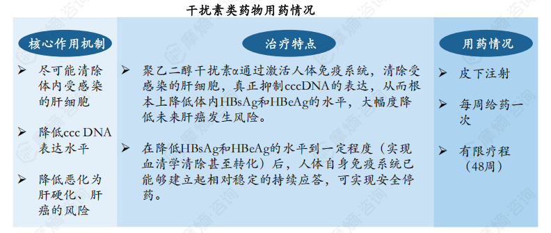 我国已上市的短效干扰素主要有重组人干扰素α1b、重组人干扰素α2a、重组人干扰素α2b;长效干扰素主要有聚乙二醇干扰素α2a、聚乙二醇干扰素α2b。其中,聚乙二醇干扰素α在实现安全停药、实现满意的治疗终点具有显著优势,该类药物每周皮下注射一次,推荐疗程为48周。
