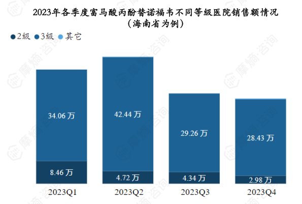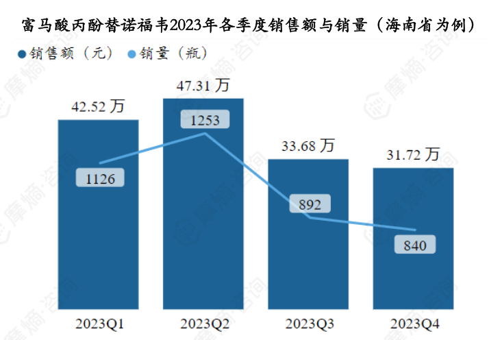 对于各级医院市场分析,据摩熵医药药物流向数据显示,以海南省为例,富马酸丙酚替诺福韦2023年各季度销售量和销售额如下图所示,其中第二季度销售额最高,为47.31万元。