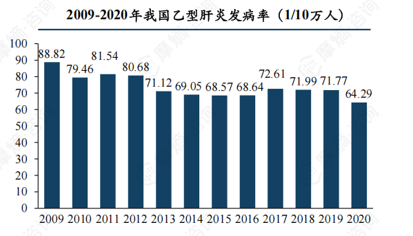 根据《慢性乙型肝炎防治指南(2022年版)》显示,我国慢性乙型肝炎病毒感染者约为8600万,慢性乙型肝炎患者约为2000万至3000万例。乙型肝炎发病率总体保持下降趋势,2020年发病率为64.29/10万人。