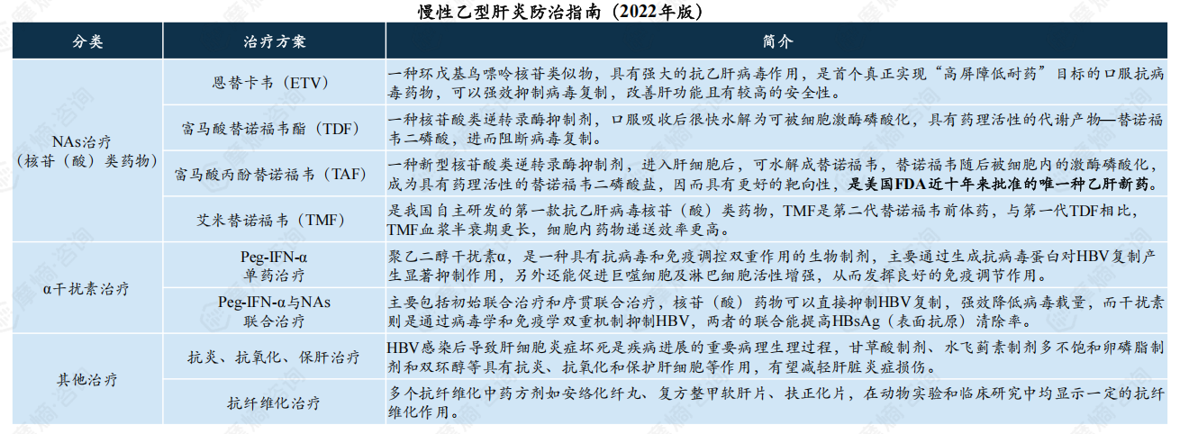 根据慢性乙型肝炎防治指南(2022年版),目前临床对慢性乙型肝炎患者主要以抗病毒治疗为主,常用的抗病毒治疗药物主要包括核苷(酸)类药物(NAs)和干扰素两大类。NAs可以直接抑制HBV复制,强效降低病毒载量,而干扰素则可通过病毒学和免疫学双重机制抑制HBV。NAs或聚乙二醇干扰素单独使用的作用有限,合理联用能够产生协同和互补的效应,是现阶段最可能实现临床治愈的治疗策略。