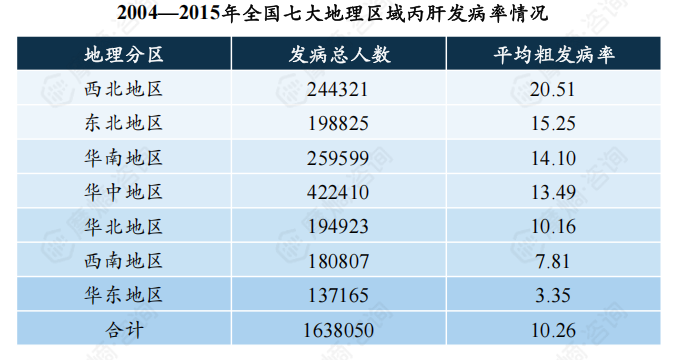 根据《丙型肝炎防治指南(2022年版)》显示,2020年我国丙肝病毒感染者估计为948.7万人,全国各地抗-HCV阳性率有一定差异,以长江为界,北方(0.53%)高于南方(0.29%)。丙型肝炎发病率总体保持稳定,2020年发病率为13.82/10万人,西北地区丙肝发病率最高。