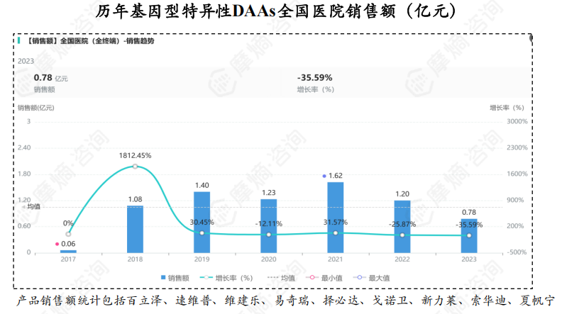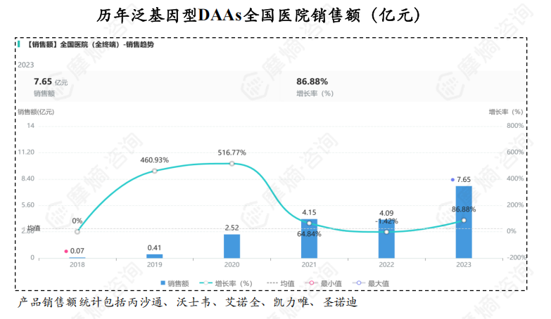 据摩熵医药销售数据库显示,基因型特异性DAAs药物整体市场规模较小,2023年医院端销售额仅0.78亿元;泛基因型DAAs药物市场规模逐步扩大,2023年全国医院销售额为7.65亿元,预计未来几年该市场将保持高速增长态势,未来泛基因型方案将成为丙肝治疗的主流方案。