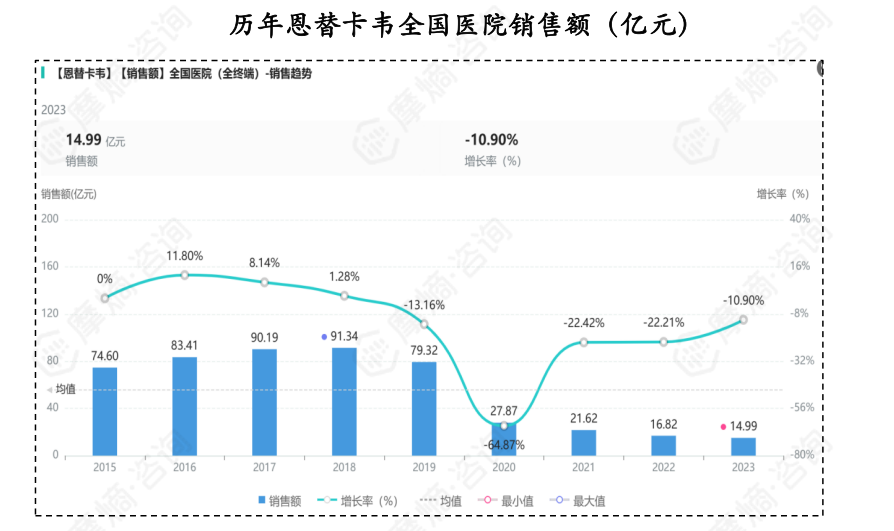 根据摩熵医药销售数据库,恩替卡韦(ETV)分别于2018年和2019年进入首轮4+7集采和第一批(4+7全国扩围)国家集采,二者皆于2019年开始实施,2019年销售额开始下降,2020年全部执行中标价后,销售额大幅下降,据统计,2023年恩替卡韦全国医院销售额仅为14.99亿元。