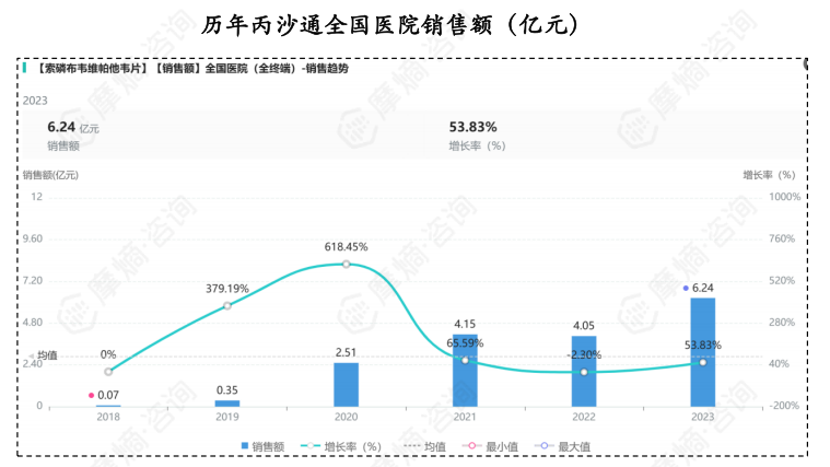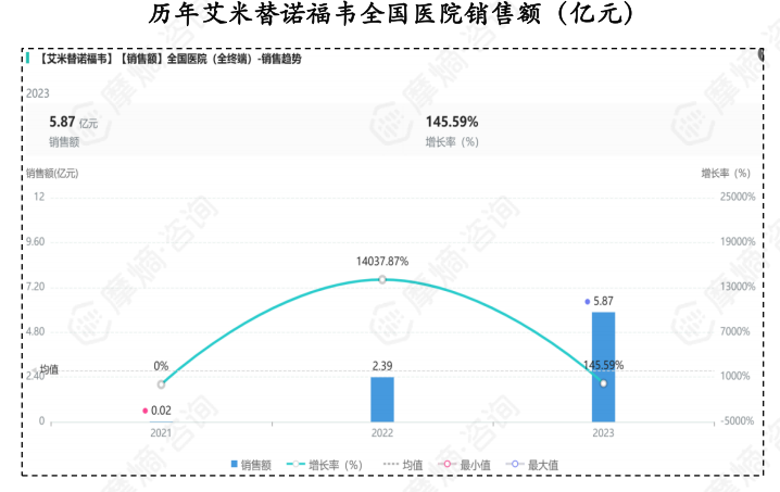 据摩熵医药数据库显示,艾米替诺福韦上市第二年放量迅速,2022年医院端销售额迅速达到2.39亿元,销售增速高达14038%,2023年医院端销售额成倍增长,达5.87亿元,该品种作为首款国产乙肝新药,有望重塑我国百亿乙肝用药市场格局。