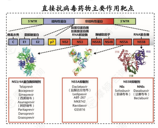 DAAs是一类针对丙型肝炎病毒的新一代药物,它们直接与病毒的生命周期相关的分子结构进行作用,直接作用于丙肝病毒蛋白酶,RNA聚合酶等病毒复制的关键节点,从而抑制病毒的复制和传播。在国际上已经获批准的DAAs中,大部分已经在我国获得批准。药物分类方面,我国已获批的丙肝直接抗病毒药物主要包括 NS3/4A蛋白酶抑制剂、NS5A抑制剂、NS5B聚合酶抑制剂。治疗方案根据适用基因型的不同分为基因型特异性方案和泛基因型方案,防治指南优先推荐泛基因型方案。