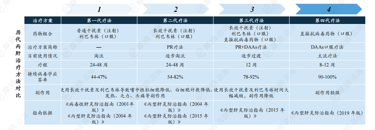 1998年,干扰素联合利巴韦林使得丙肝的治疗效果大大提升,成为丙肝初代疗法;2001年,聚乙二醇干扰素获批,进一步提升了丙肝的治愈率,长效干扰素联合利巴韦林成为第二代疗法;2011年,直接抗病毒药物(DAAs)的成功上市使得丙肝的治愈率大幅上升,开启了丙肝直接抗病毒治疗时代。目前,DAAs口服疗法已成为目前丙肝治疗领域的主流疗法。
