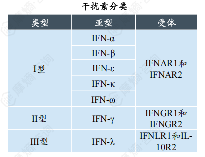 干扰素(Interferon,IFN)是一类具有多种生物学活性的低分子量蛋白质,通过诱导细胞表面受体使细胞产生抗病毒蛋白而抑制病毒复制,根据其结合的不同受体分为三种类型(I型、II型和III型)。