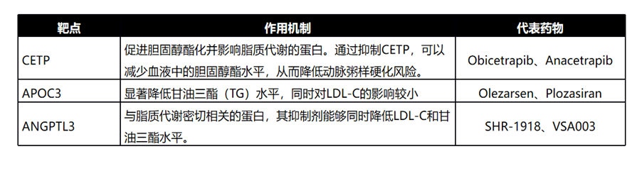 除了PCSK9和Lp(a),降脂领域还有多个其他靶点正在积极研发中,包括CETP、APOC3和ANGPTL3等。