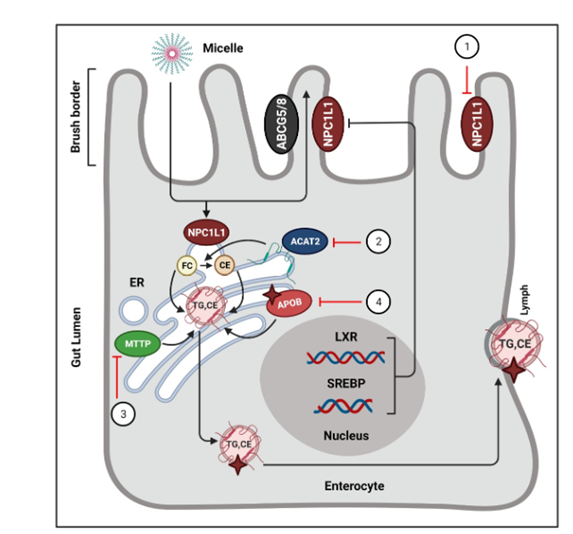 作用机制:小肠黏膜刷状缘的NPC1L1蛋白(Niemann-Pick C1-Like 1)是介导肠道胆固醇吸收的关键转运蛋白,负责将饮食来源的外源性胆固醇和胆道重吸收的内源性胆固醇转运至肠上皮细胞。依折麦布是首个NPC1L1抑制剂,通过与NPC1L1胞外区C环第61位氨基酸结合,阻断其构象变化,抑制Y1306VNxxF结构域解离及NUMB蛋白的招募,从而阻碍胆固醇的跨膜转运。同时干扰NPC1L1与Flotillin-1/-2形成的胆固醇富集膜微域,减少胆固醇在肠道的吸收[6]。