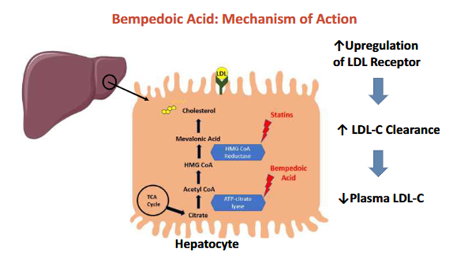 作用机制:ACL是胆固醇合成途径中的关键酶,位于HMG-CoA还原酶(他汀类药物的靶点)上游。ACL催化柠檬酸裂解为乙酰辅酶A(Acetyl-CoA)和草酰乙酸(OAA),而Acetyl-CoA是胆固醇和脂肪酸合成的初始原料。贝派地酸作为前药,需在肝脏中被超长链酰基辅酶A合成酶1(ACSVL1)激活为ETC-1002-CoA,进而抑制ACL活性,减少Acetyl-CoA生成,从而阻断胆固醇的合成。ACL抑制后,肝细胞内胆固醇水平下降,通过负反馈机制上调低密度脂蛋白受体(LDL-R)的表达,增强对血浆LDL-C的摄取和清除。贝派地酸仅在肝脏被激活,避免在骨骼肌代谢,从而降低肌痛等副作用。
