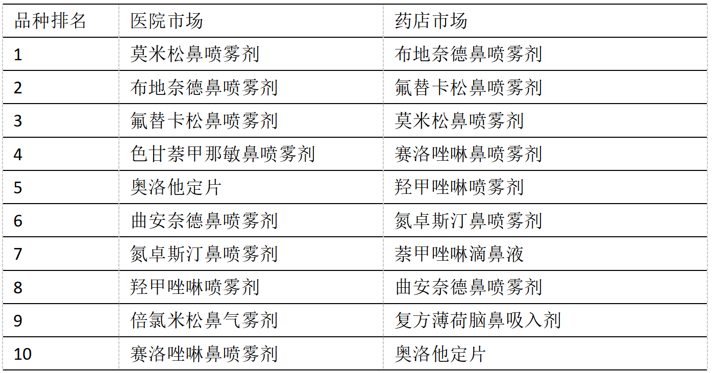 来自行业研报的数据,2023年国内AR领域院内市场和药店市场Top10品种均由鼻喷剂垄断。