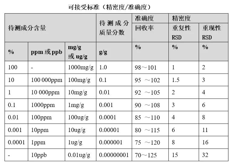 注:在基质复杂、含量低于0.01%及多成分等分析中,接受范围可适当放宽。