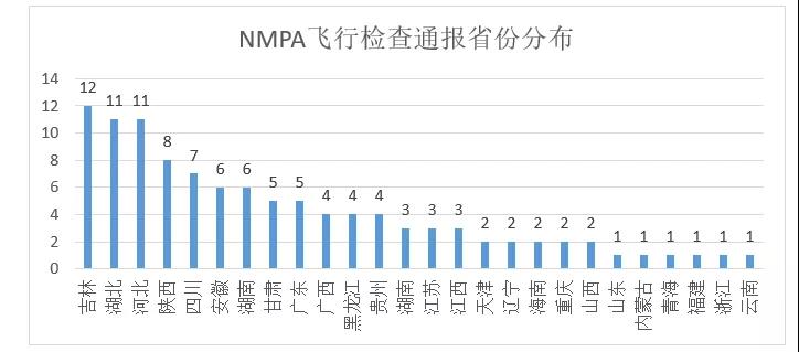 被飞检通报次数最多的三个省份分别是吉林、湖北以及河北省。这三个地区均在药品生产企业国内排名前十的省份之中(前十省份的药企占比约为全国总数的55%)。