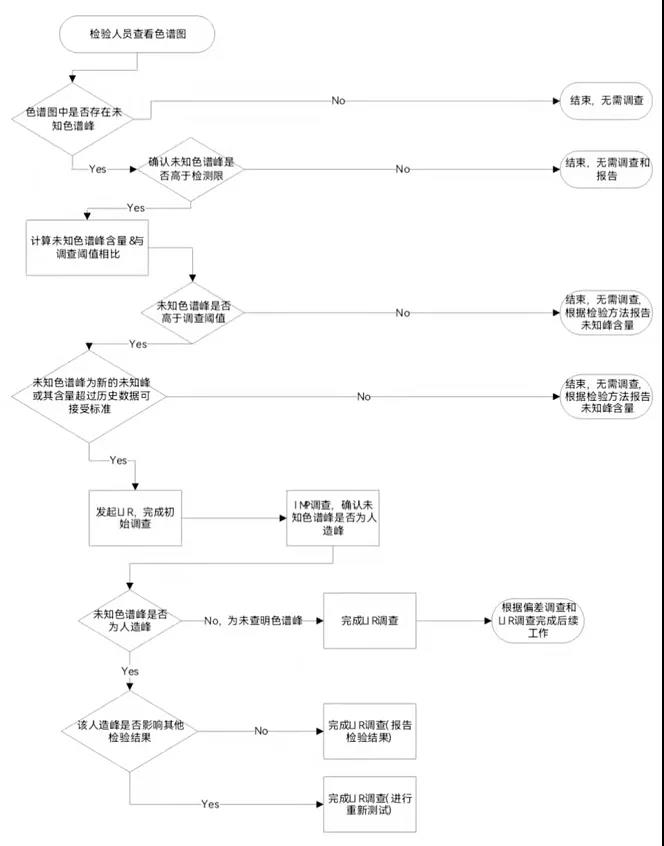 当未知色谱峰首次出现且超出调查阈值,或其含量超过已有文件记录的可接受标准,需发起实验室调查。实验室调查需排除色谱峰是否为人为引入的非药品本身含有的色谱峰。