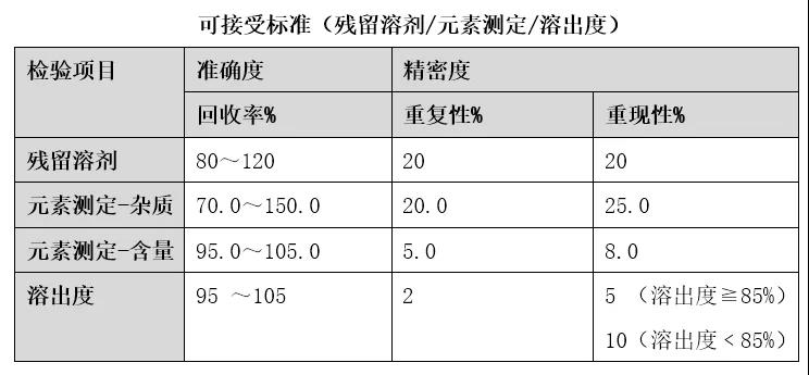 美国药典检验方法验证指导原则USP1225 Validation of compendial procedures没有对可接受标准进行指导,但在通则中USP233 Elemental Impurities-Procedures;USP730Plasma Spectrochemistry;USP1092 The Dissolution Procedure;Development and Validation,USP1467 Residual Solvents-Verification ofCompendial Procedures and Validation of Alternative Procedures中分别对元素测定、溶出测定以及残留溶剂测定的验证可接受标准进行了明确的指导,通过多年的实践经验,个人认为限度是可执行的也是合理。总结如下: