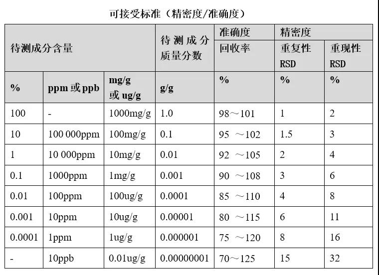 注:在基质复杂、含量低于0.01%及多成分等分析中,接受范围可适当放宽。可接受范围可在给出数值0.5~2倍区间。