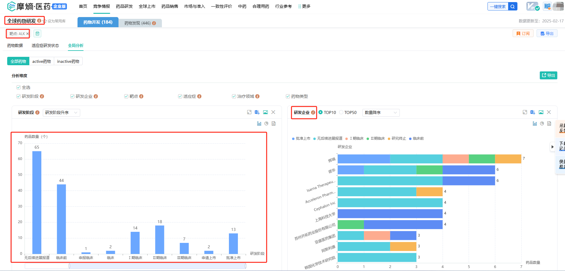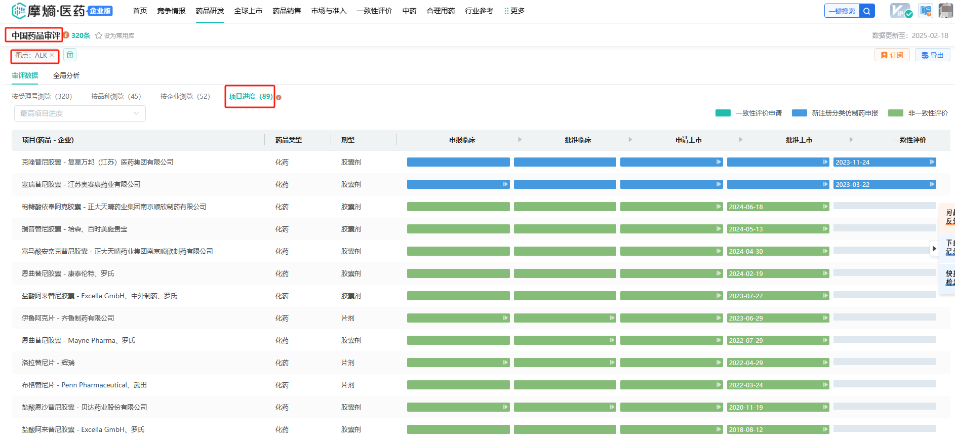 再比如,在Deepseek结果中尚未提到ALK靶点相关的药物和为满足的临床需求,通过摩熵医药-中国药品审评数据库和全球药物研发数据库可以获得该靶点最新的审批动态和竞争格局的分析。