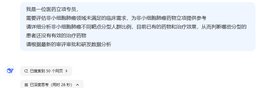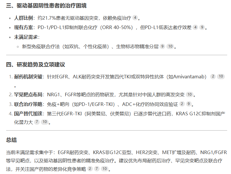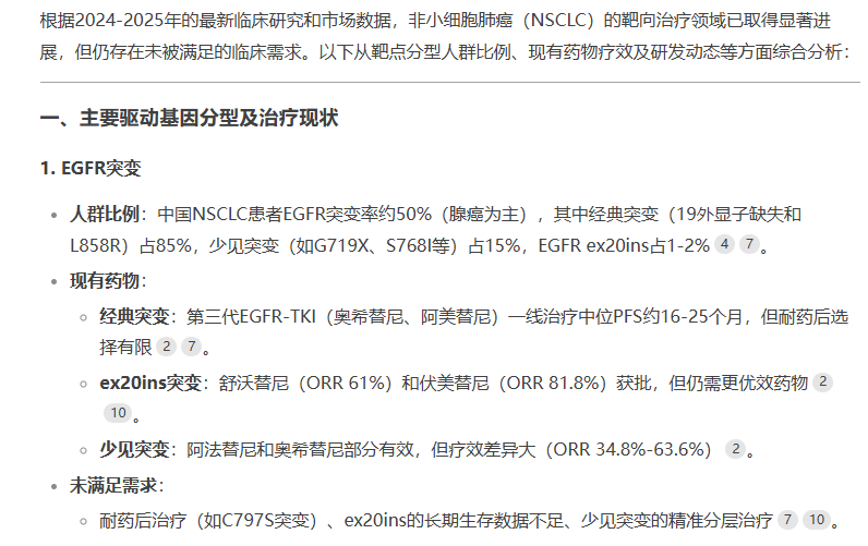 我们以非小细胞肺癌领域未满足的临床需求分析为例,看看DeepSeek 实战结果: