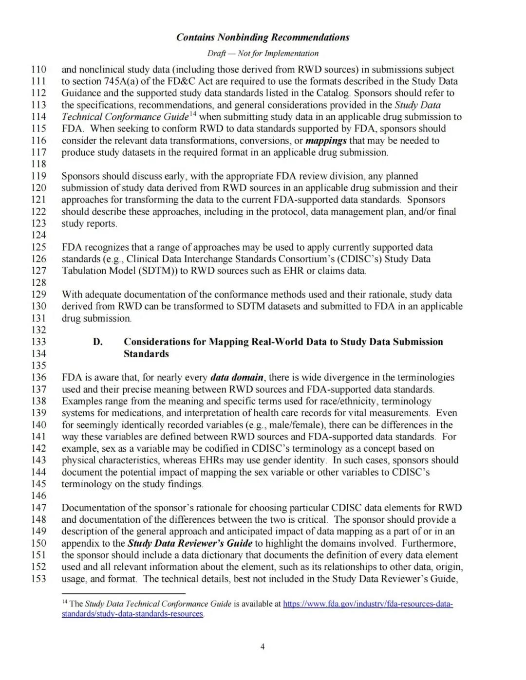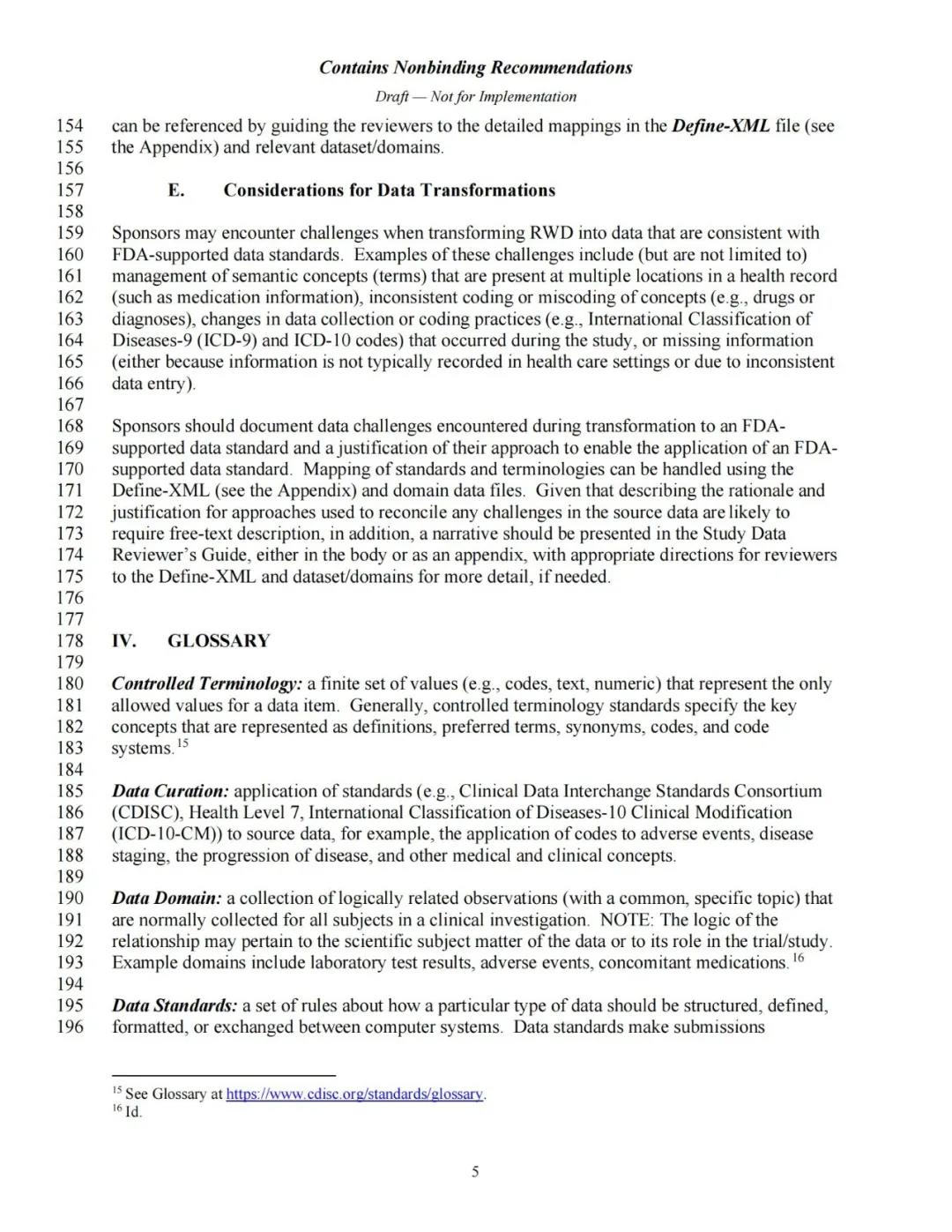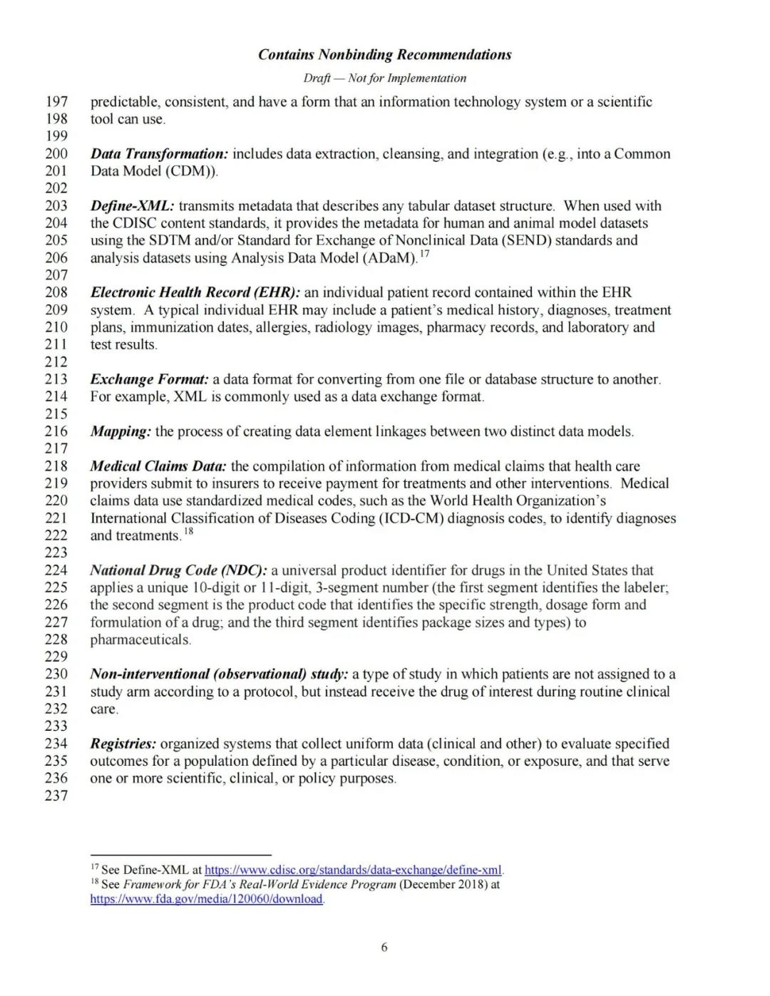 FDA 认识到可以使用一系列方法将当前支持的数据标准(例如,临床数据交换标准联盟 (CDISC, Clinical Data Interchange Standards Consortium) 的研究数据列表模型 (SDTM, Study Data Tabulation Model))应用于 EHR 或claims data医保数据等 RWD 来源。