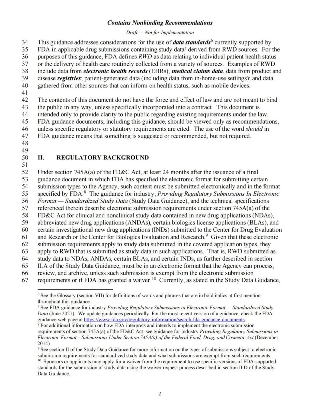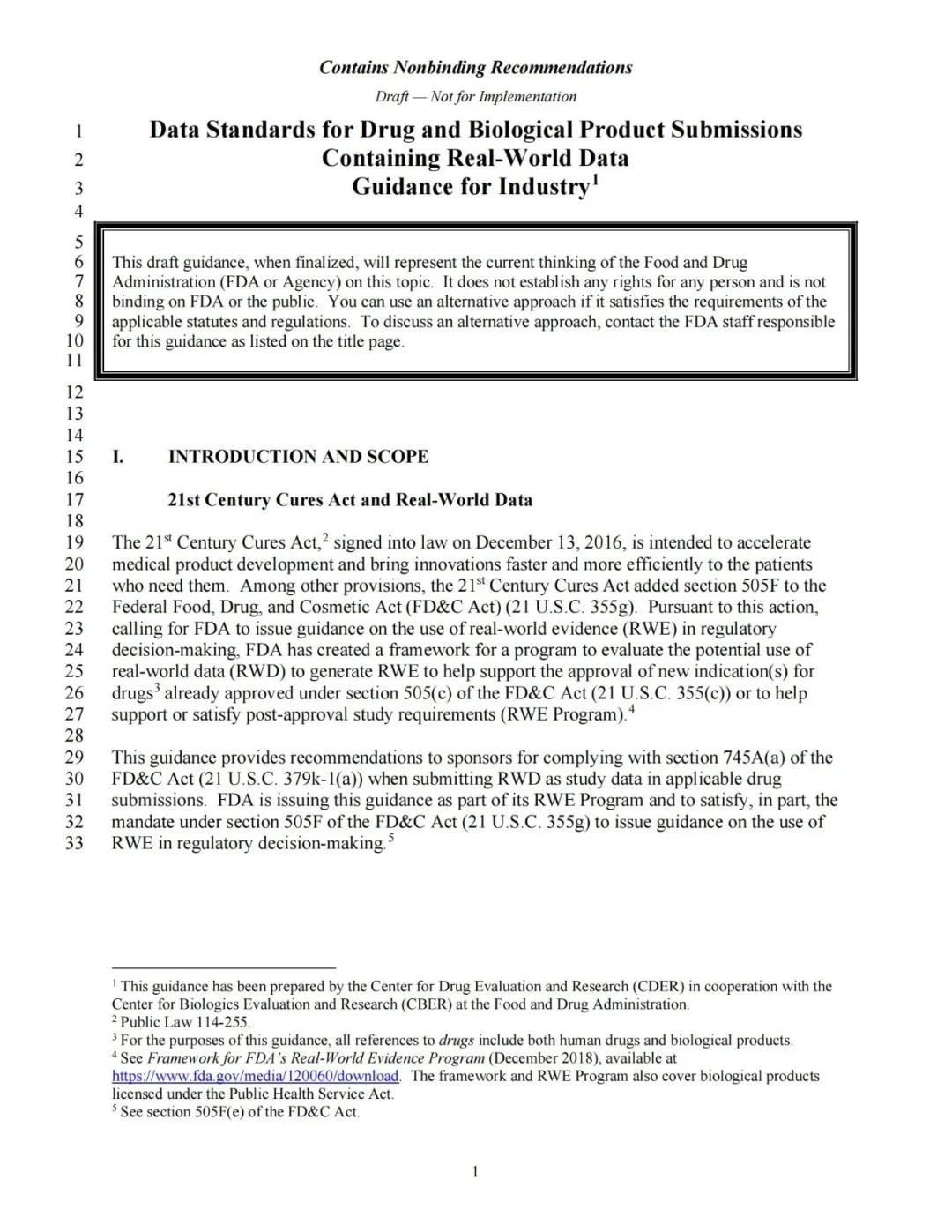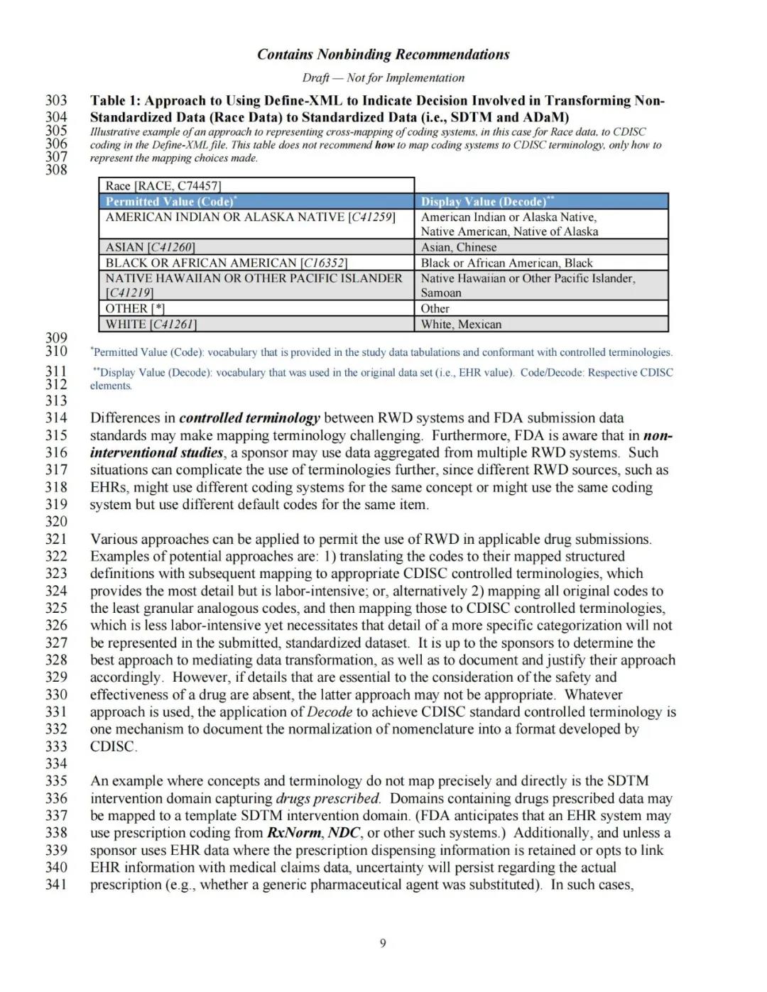 FDA 认识到可以使用一系列方法将当前支持的数据标准(例如,临床数据交换标准联盟 (CDISC, Clinical Data Interchange Standards Consortium) 的研究数据列表模型 (SDTM, Study Data Tabulation Model))应用于 EHR 或claims data医保数据等 RWD 来源。