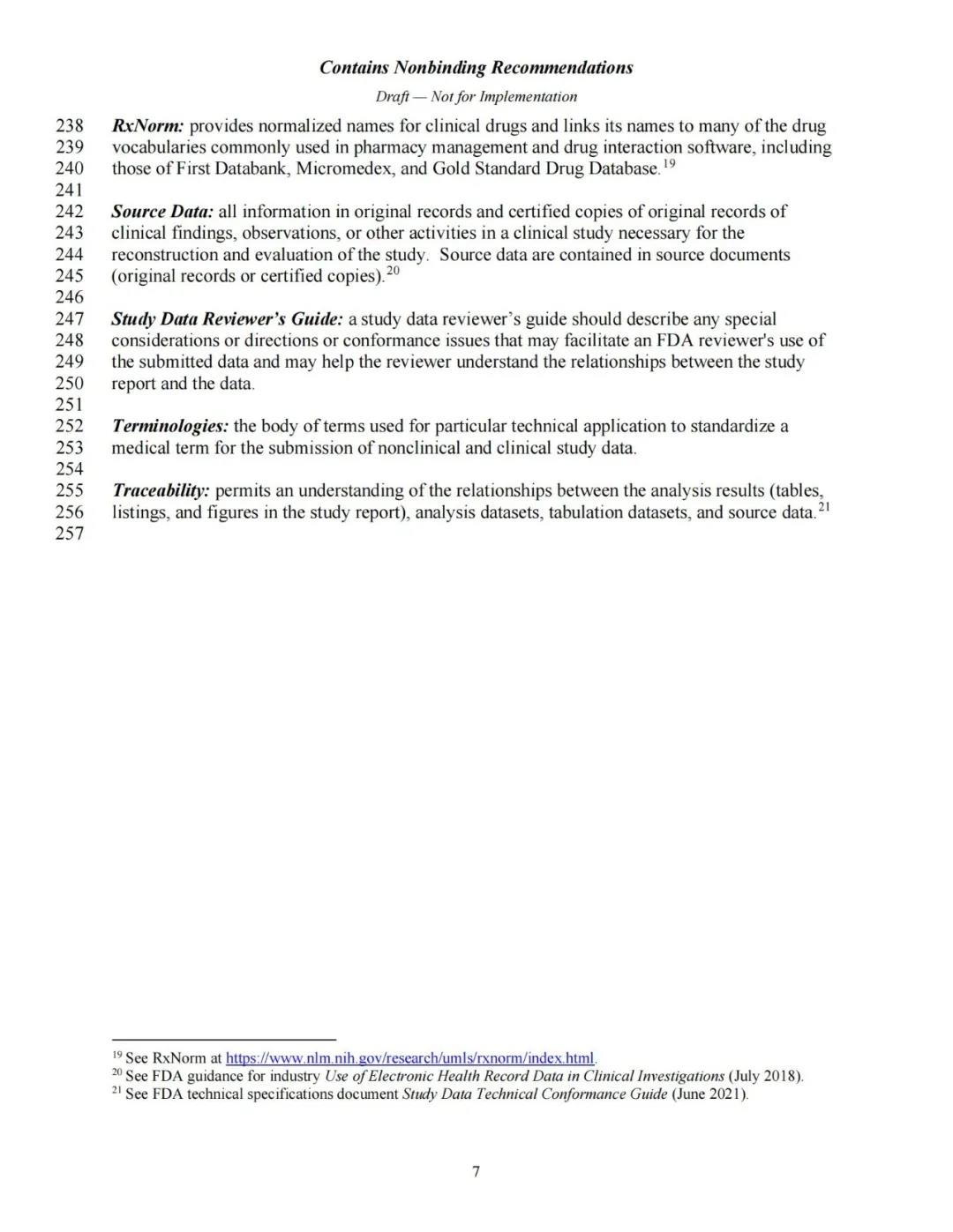 FDA 计划发布进一步的指导和/或更新目录,其中包含来自 RWD 来源的研究数据的标准。目前,在没有豁免的情况下,申办者在提交FD&C 法案第 745A(a) 节要求提交的临床和非临床研究数据(包括那些来自 RWD 来源的数据)必须使用研究数据指南中描述的格式和支持的格式。目录中列出的研究数据标准。申办者在向 FDA 提交适用的药物研究数据时,应参考研究数据技术一致性指南中(Study Data Technical Conformance Guide)要求的规范、建议和一般注意事项。在寻求使 RWD 符合 FDA 支持的数据标准时,申办者应考虑在适用的药物提交中以所需格式生成研究数据集可能需要的相关数据转换、转换或映射。