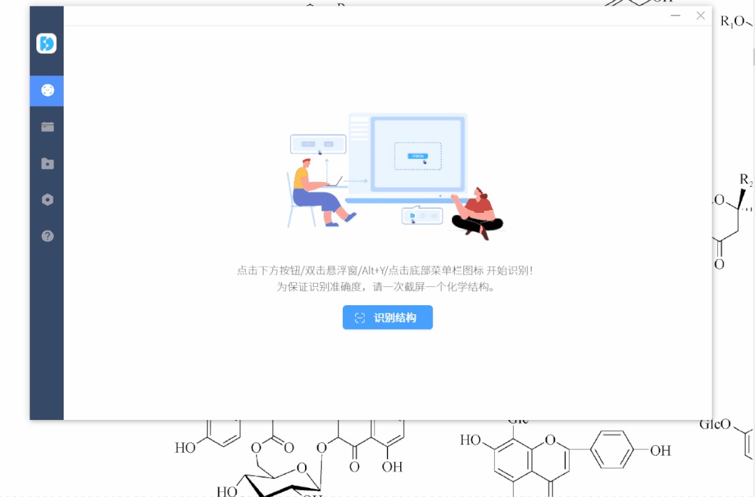 - 一键截图,随时随地截取化学结构;左右对照视图,方便识别后的化学结构对比操作。支持自定义快捷键截图识别化学结构。