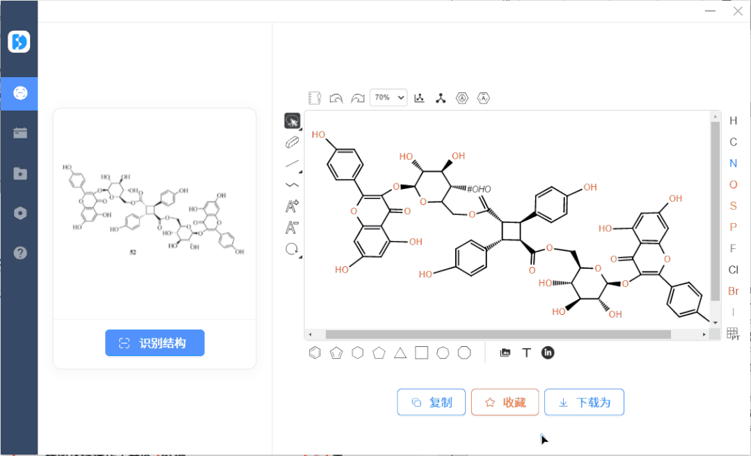 - 支持将识别后的化学结构收藏起来,方便下次使用查看。识别后的结构点击收藏支持查看各类分子性质预测结果。