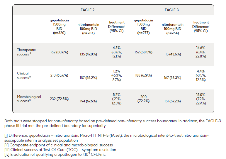 该新药申请得到了关键性3期试验EAGLE-2(N=1531;NCT04020341)、EAGLE-3(N=1605;NCT04187144)的积极结果的支持,这两项试验比较了Gepotidacin与呋喃妥因在无并发症尿路感染(uUTI)患者中的疗效和安全性。研究参与者被随机分配接受Gepotidacin 1500mg每日两次或呋喃妥因 100mg每日两次,共5天。两项试验的主要终点是呋喃妥因敏感的尿路病原体参与者在治愈测试访问中的临床和微生物学综合反应。