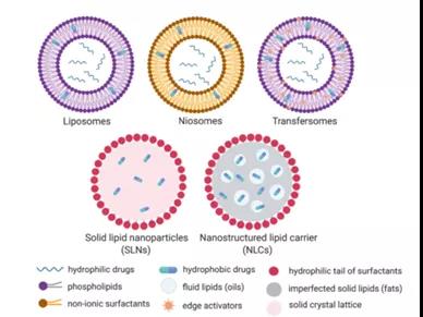 根据制备方法和制剂的物理化学性质,脂质纳米粒可分为5类。它们是脂质体(liposome)、非离子表面活性剂脂质体(niosome)、转移体(tansfersome)、固体脂质纳米粒(SLN)和纳米结构脂质载体(NLC)。图2和表1描述了每种类型颗粒的主要特性。简言之,由磷脂和胆固醇构成的脂质体具有强大的药物保护能力和靶向能力。与处于循环系统的游离药物相比,这些特性使得脂质体具有更低的毒性和更好的疗效。但是脂质体在角质层中缺乏穿透能力,其在皮肤给药中的应用受到了限制。其他缺点包括亲水性药物的包封性差,以及由于药物在介质中泄漏而导致的储存稳定性差。非离子表面活性剂脂质体(niosome)的是一种脂质体的类似物,是由非离子表面活性剂和胆固醇在水相条件下形成的脂质体,它比脂质体具有更好的稳定性和更长的货架期。此外,与带正电的脂质体相比,它们的中性壳具有相容性。尽管具有优越的性质,但由于缺乏离子排斥作用,非离子表面活性剂脂质体也会发生药物泄漏和颗粒聚集,这一直是FDA批准的障碍。转运体是由磷脂、边缘激活剂(EA)和胆固醇组成的弹性或可变形纳米颗粒。EA的加入增强了它们的柔韧性,促进了其组织渗透性。转运体包载亲脂性分子时,具有最高的穿透能力和包封效率。它们的氧化降解和高昂的材料成本仍然是大量生产此类颗粒的挑战。所有这些具有亲水核的亲脂性双层多层纳米颗粒都能够在没有化学干预的情况下包载亲水性和疏水性药物。疏水性药物优先夹在外部双层中,而亲水性分子则进入水腔中(图2)。因此,这些颗粒被认为是广谱药物的有效载体,能够对药物提供足够的保护、实现可持续的药物释放和提高的生物利用度。