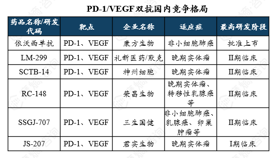竞争格局方面,依沃西单抗是全球首款获批上市的PD-1/VEGF双抗药物,国内礼新医药、神州细胞、荣昌生物等多家企业管线尚处于临床Ⅱ期阶段。