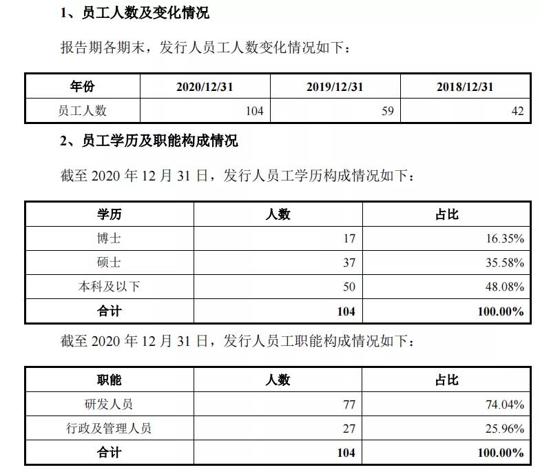 去年,亚虹医药的员工人数大增76.27%,达104人。2018年-2020年,亚虹医药的员工人数分别为42人、59人、104人;学历来看,截至2020年12月31日,亚虹医药员工中,博士学历17人,占比16.35%;硕士37人,占比35.58%;本科及以下50人,占比48.08%;