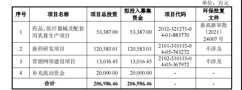 亚虹医药希望在上交所科创板募集资金20.70亿元,原因是有四大项目需要筹措资金。其中5.34亿元用于“药品、医疗器械及配套用乳膏生产项目”、12.06亿元用于“新药研发项目”、1.30亿元用于“营销网络建设项目”、2.00亿元用于“补充流动资金”。