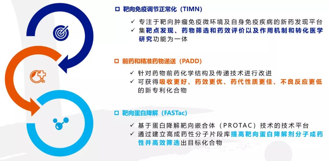 创新药物的发现是一个非常复杂和极富挑战的过程。亚虹医药通过多年的药物临床研发实践,构建了靶向免疫调节正常化(TIMN)技术平台、前药和精准药物递送技术(PADD)平台、基于片段组合的蛋白降解嵌合体(FASTac)技术平台三大核心技术平台,利用上述核心技术平台研发形成了目前在研管线中的主要候选药物,并为后续开发新的候选药物和形成新的临床管线奠定坚实基础。