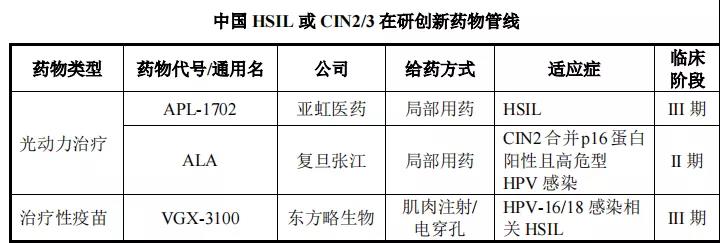 APL-1702(希维她®)是集药物和器械为一体的光动力治疗产品,主要用于治疗包括所有HPV病毒亚型感染所致的子宫颈高级别鳞状上皮内病变(HSIL)。目前,在全球范围内尚无针对 HSIL 的非手术治疗产品获批上市。在中国,截至 2021 年 3 月 31 日,有 3 个针对 HSIL 或 CIN2/3 的治疗性药物进入临床试验,包括 2 个光动力治疗药物和 1 个治疗性疫苗,其中亚虹医药和东方略都进入了临床三期,复旦张江紧随其后进入临床二期。目前,亚虹医药已拥有APL-1702在全球的独家开发和商业化权益,正在开展的APL-1702的国际多中心III期临床试验。